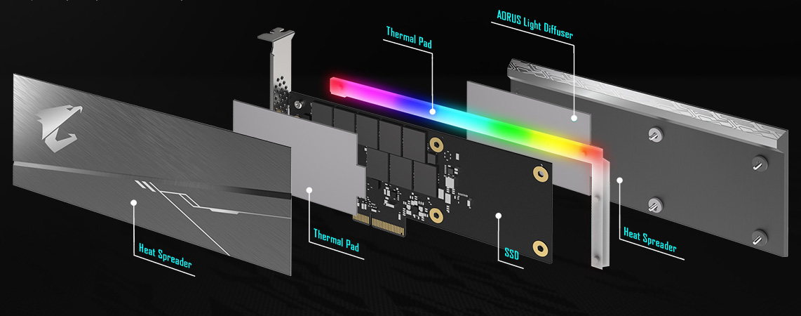 | Ổ cứng Gigabyte Aorus RGB PCIe AIC Gen3 x4 NVMe DOMINANT IN DARKNESS Được trang bị chuẩn giao tiếp M.2 PCIe Gen3 x4, ổ cứng Gigabyte Aorus RGB AIC PCIe Gen3 x4 NVMe M.2 mang lại tốc độ cực nhanh lên đến 3480MB/s đọc tuần tự và 2100MB/s ghi tuần tự. Bộ tản nhiệt giữ cho SSD luôn trong điều kiện hoạt động tốt nhất và được trang trí thêm bằng hệ thống RGB có thể tùy chỉnh và đồng bộ với hệ thống RGB đang có sẵn trên máy tính của bạn. |  |