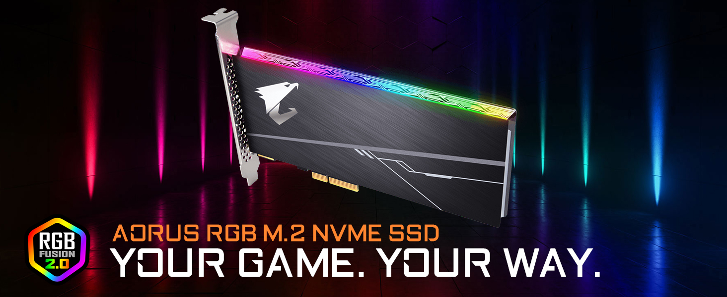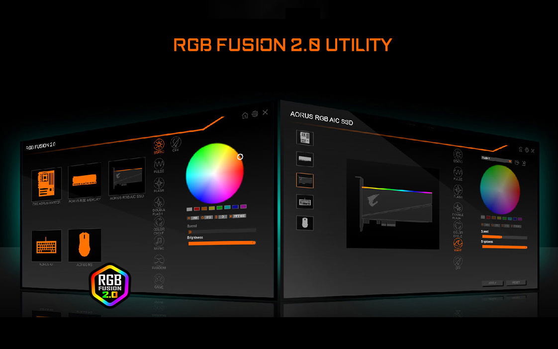 RGB Fusion 2.0 Ổ cứng Gigabyte Aorus RGB PCIe AIC Gen3 x4 NVMe là dòng SSD đầu tiên trên thế giới có thể đồng bộ hóa hoàn hảo với bo mạch chủ mà không cần cắm dây, hỗ trợ 6 hiệu ứng ánh sáng bao gồm tĩnh, nhấp nháy, flash, flash kép và chu kỳ màu.
