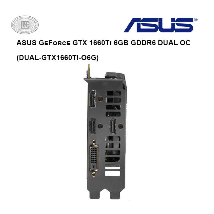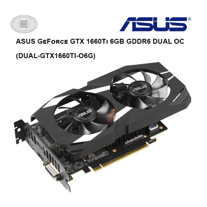 Tên sản phẩm: Card màn hình/ VGA ASUS Dual GeForce GTX 1660 Ti OC 6GB GDDR6 (DUAL-GTX1660TI-O6G) - Chip đồ họa: NVIDIA GeForce GTX 1660Ti - Bộ nhớ: 6GB GDDR6 ( 192-bit ) - GPU clock OC Mode - GPU Boost Clock : 1830 MHz , GPU Base Clock : 1530 MHz Gaming Mode (Default) - GPU Boost Clock : 1800 MHz , GPU Base Clock : 1500 MHz - Nguồn phụ: 1 x 8-pin